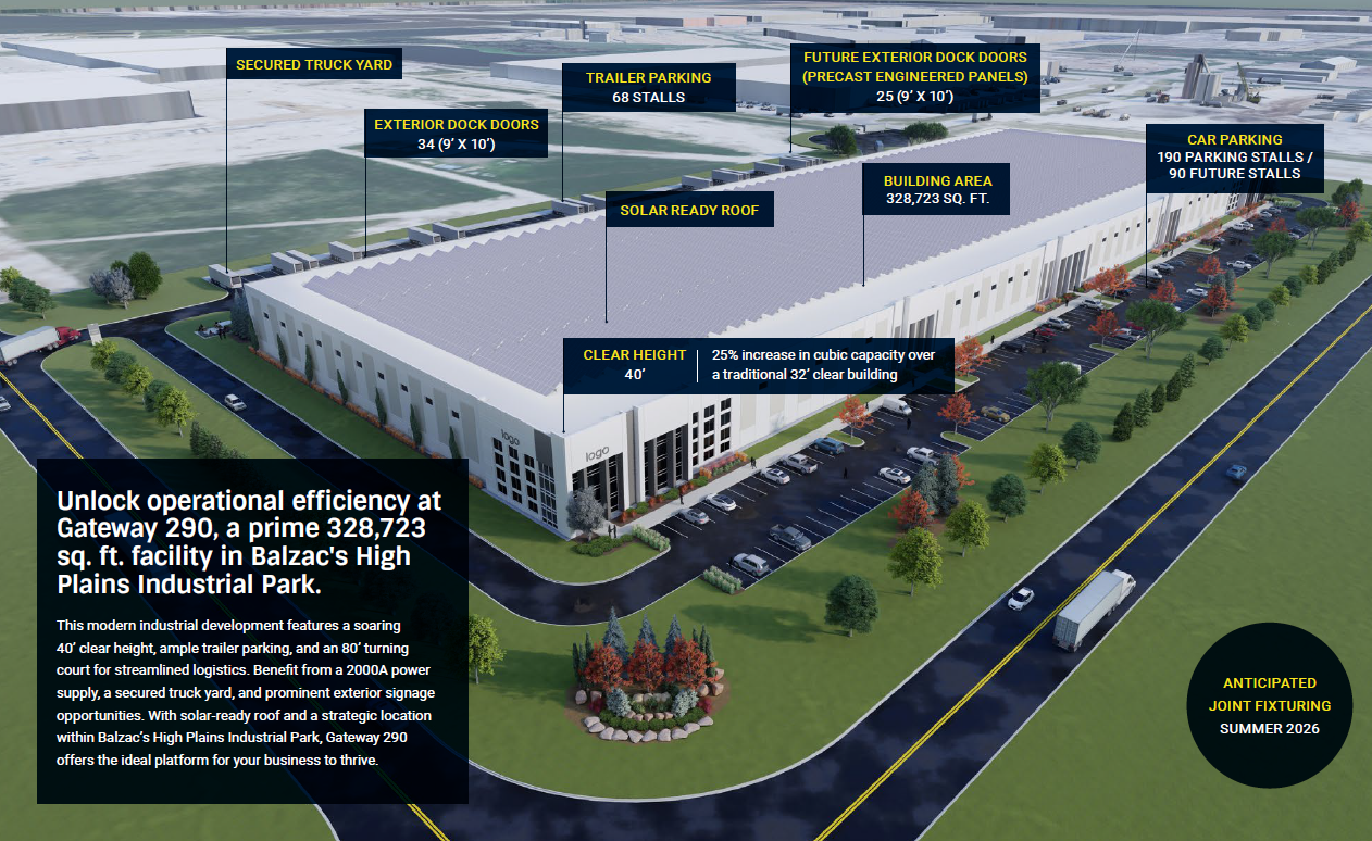 After purchasing a 17.5 acre parcel in early 2025, we secured construction financing with Canadian Western Bank on 100% spec building, a rare occurrence in a challenging lending market. Construction started in June on our state-of-the art 328,723 SF Tier 1 new-generation warehouse, the Gateway 290.